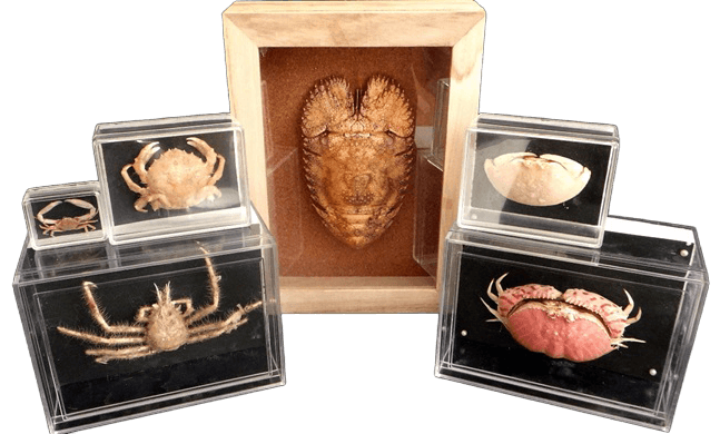 自然が生み出す造形美をそのままに、エビ・カニ類の脱皮殻や混獲された貝類を標本化。色や形状の多様性は、一点ずつ異なる個性を放ちます。身近でありながら、観察することで新たな魅力が浮かび上がるコレクションです。