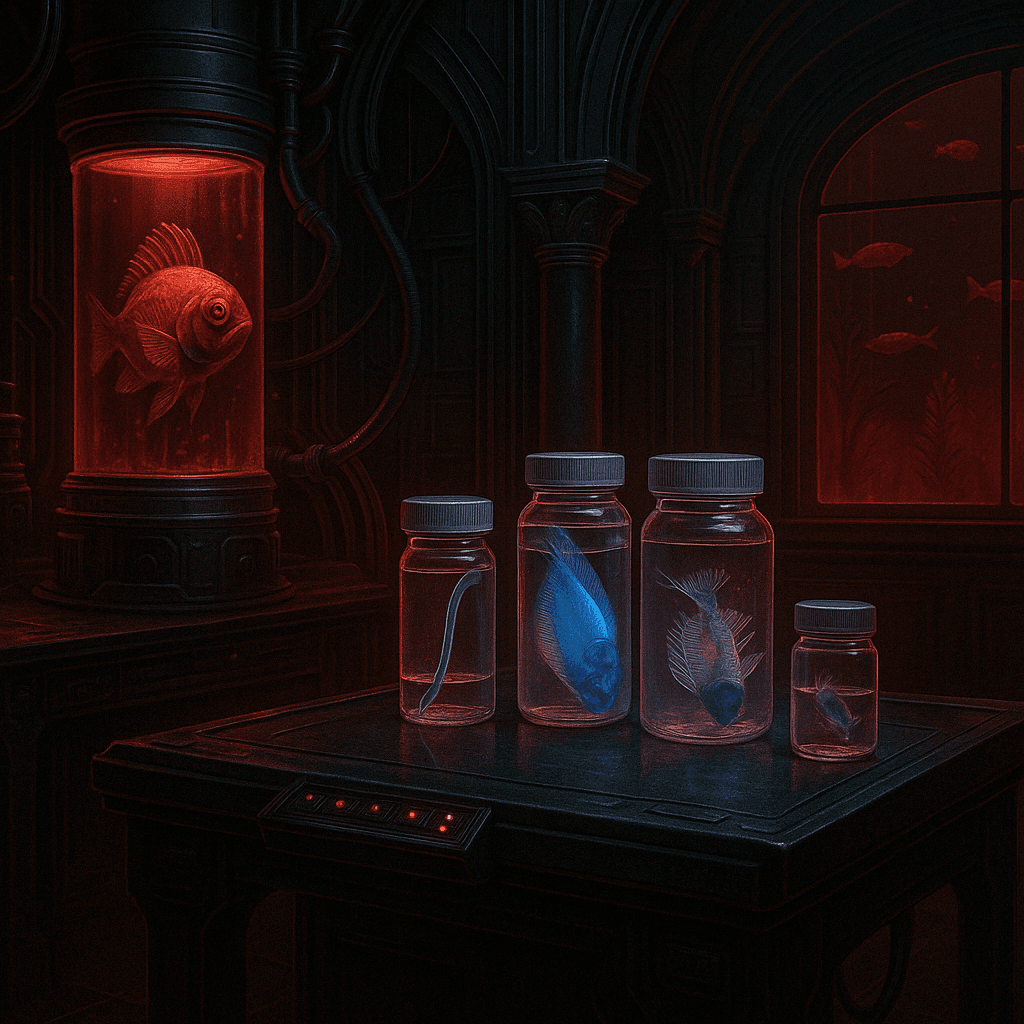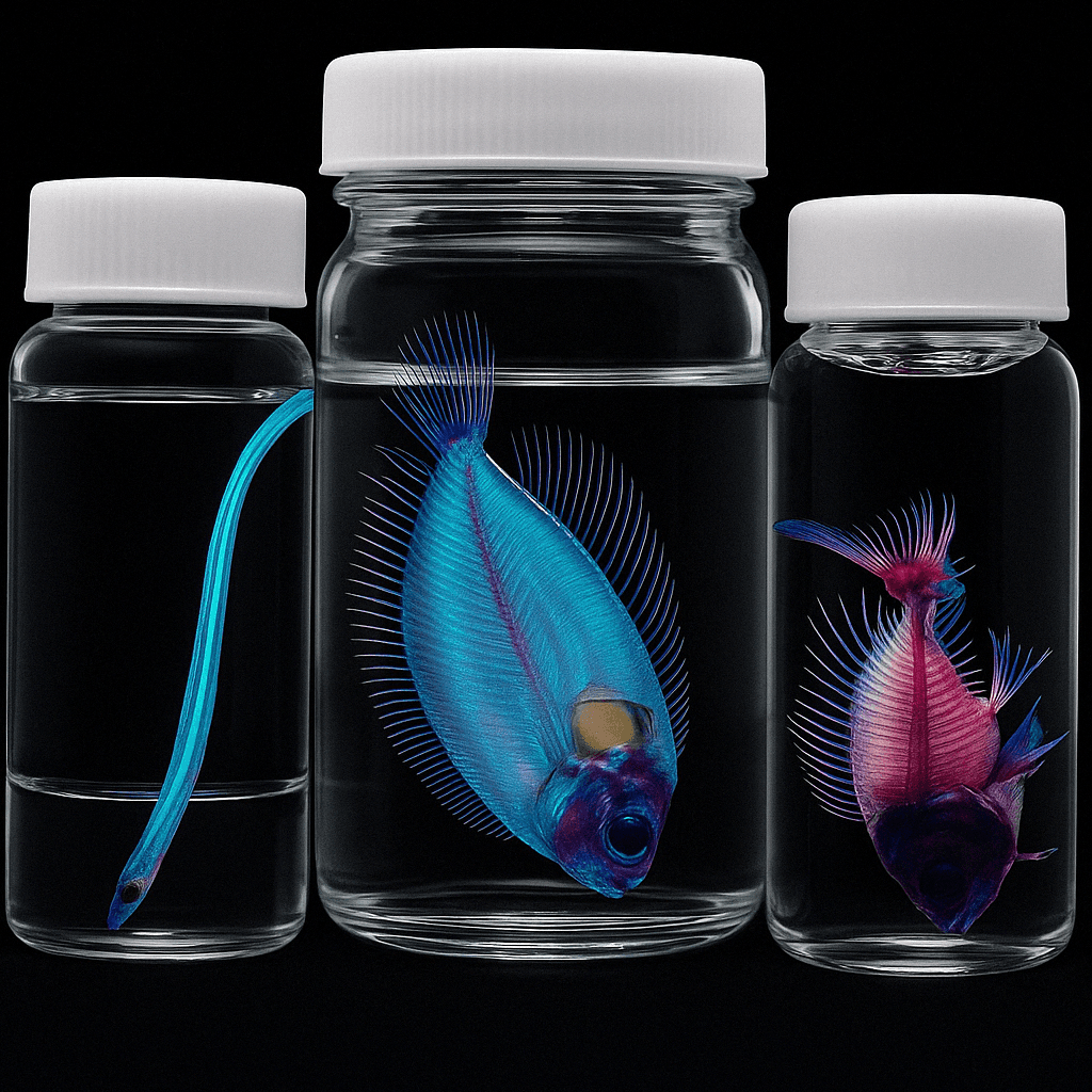 薬品による処理と染色によって、骨格構造を視覚的に楽しめる透明標本。赤と青で染め分けられた硬骨と軟骨が、まるでアートのように浮かび上がります。深海魚から身近な魚まで、標本ならではの姿が魅力です。